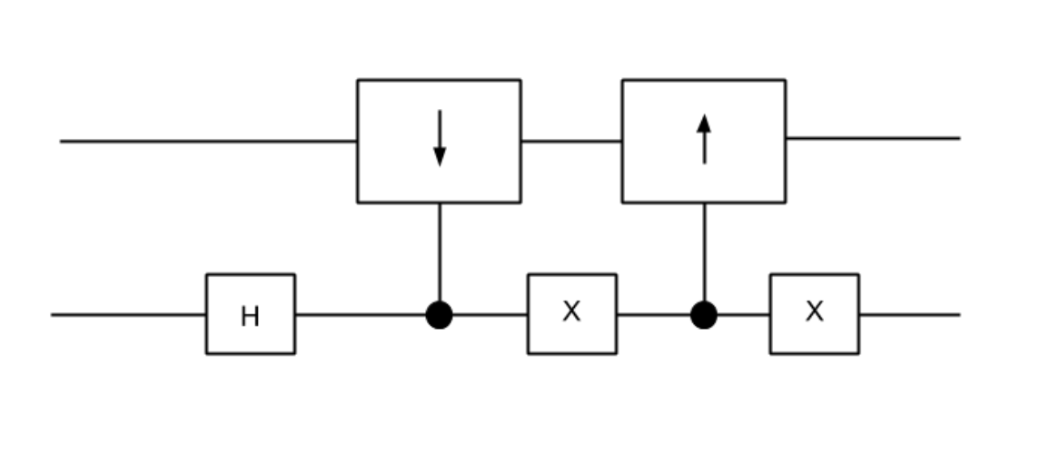 also say that our coin vector is initialized in the \(|\downarrow\rangle\) state. Since \(|\downarrow\rangle\) corresponds to \(|1\rangle\), the only operations that have to be performed in this qubit initialization method is